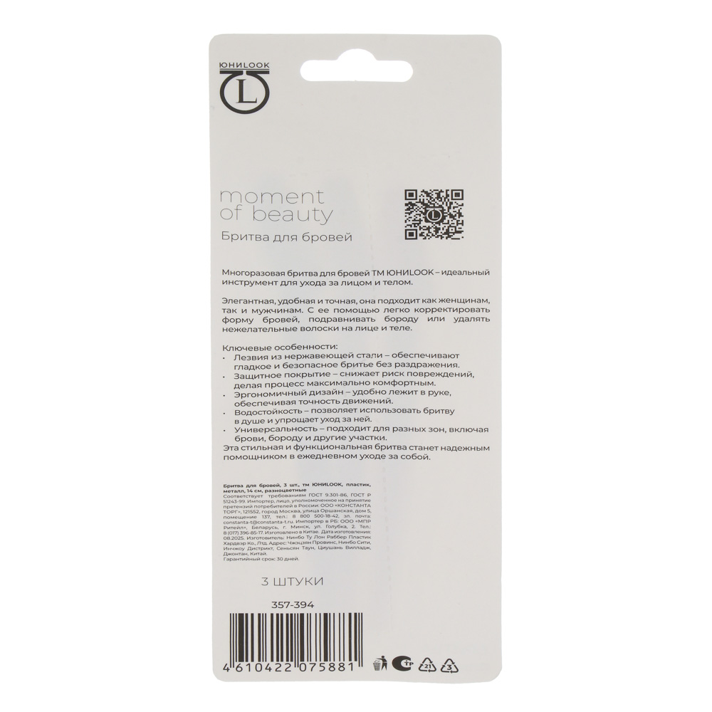 Бритва для бровей тм ЮНИLOOK 3 штуки в наборе, пластик, металл, 14 см, разноцветные – это инструмент, который предназначен для коррекции формы бровей, для формирования окончательного контура бороды, а также для удаления нежелательных волосков на лице и на теле. Острые лезвия из нержавеющей стали обеспечивают гладкое и безопасное бритьё без раздражения. Защитное покрытие снижает риск повреждений и царапин, делая процесс максимально комфортным. Бритва удобно лежит в руке, обеспечивая точность движений. Надежный помощник в ежедневном уходе за собой.