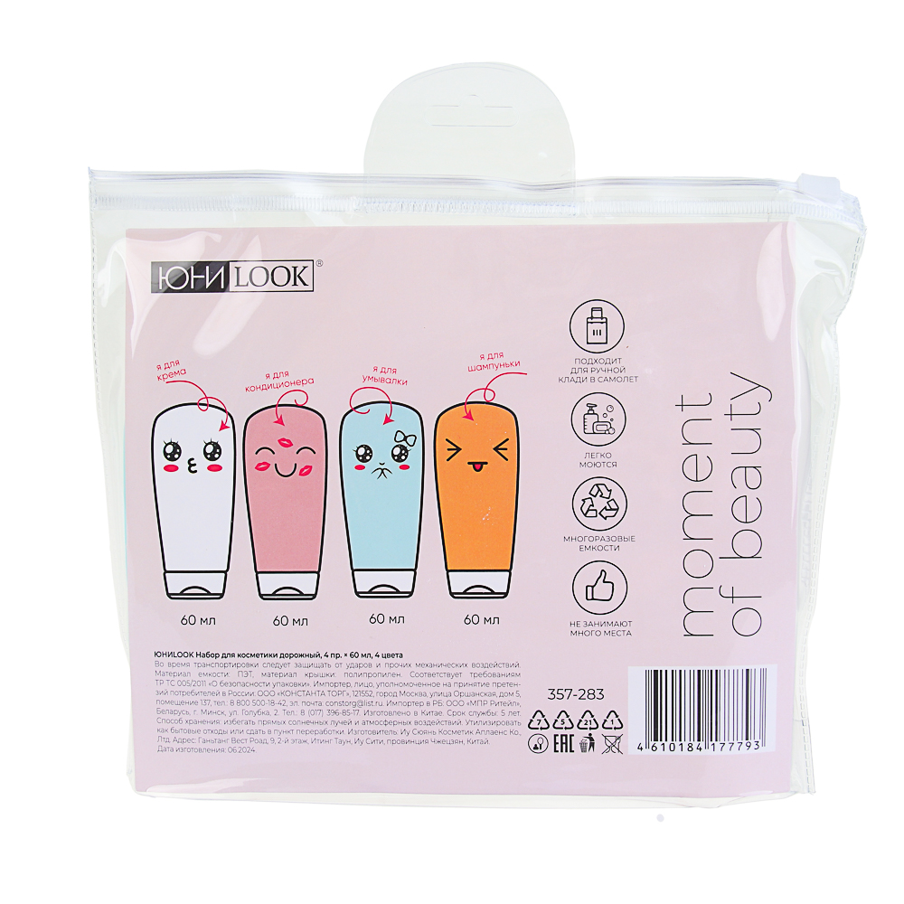 Четыре тюбика по 60 мл из плотного матового силикона с удобным дозатором станут отличными помощниками в путешествии. Вы можете наполнить их шампунем, бальзамом, увлажняющим кремом или антисептиком. Благодаря маленькому размеру, тюбики можно спокойно перевозить в ручной клади в самолете или брать в поход, ведь они занимают совсем мало места. Набор ЮНИLOOK станет отличным подарком. Все составляющие набора многоразовые и прослужат ещё не один отпуск.