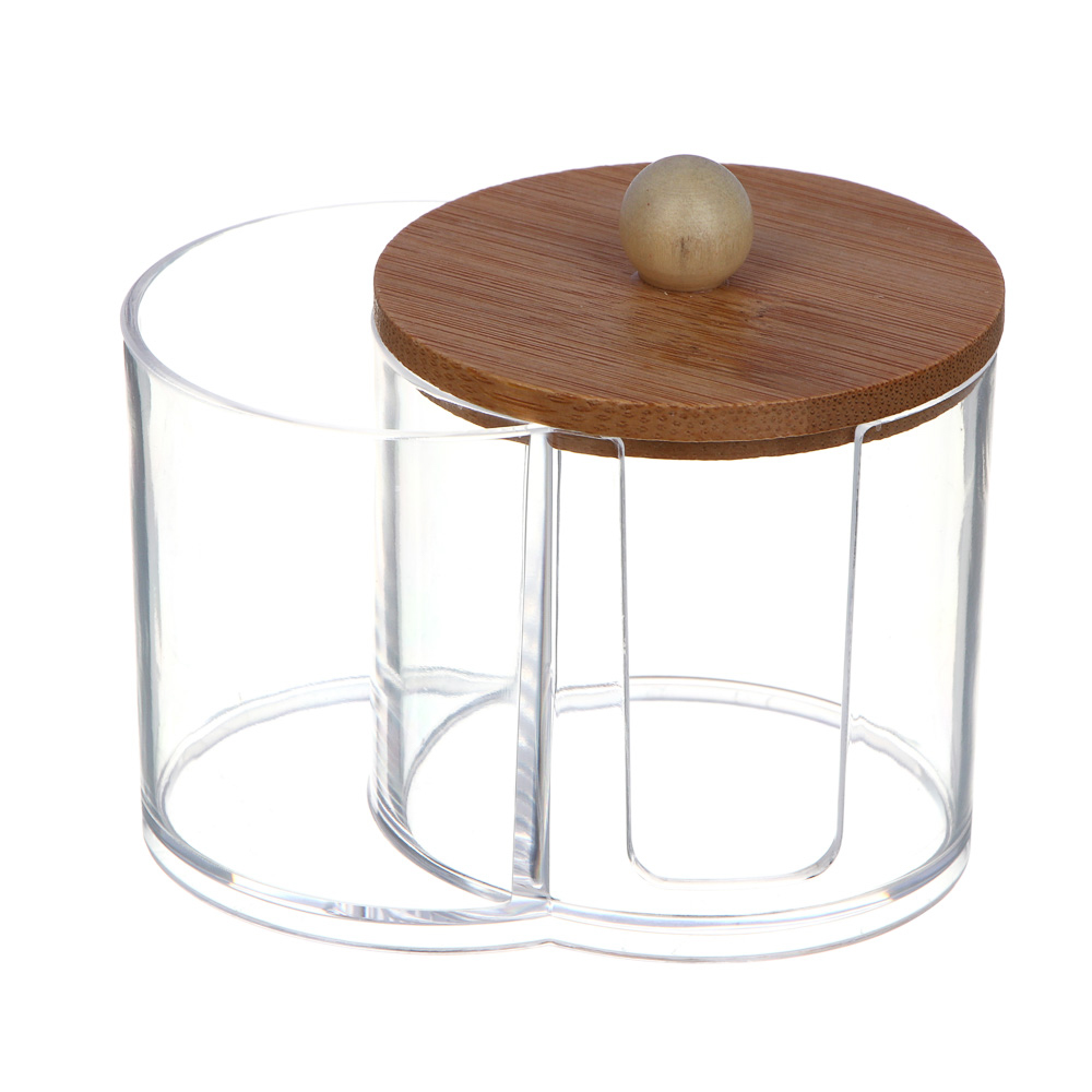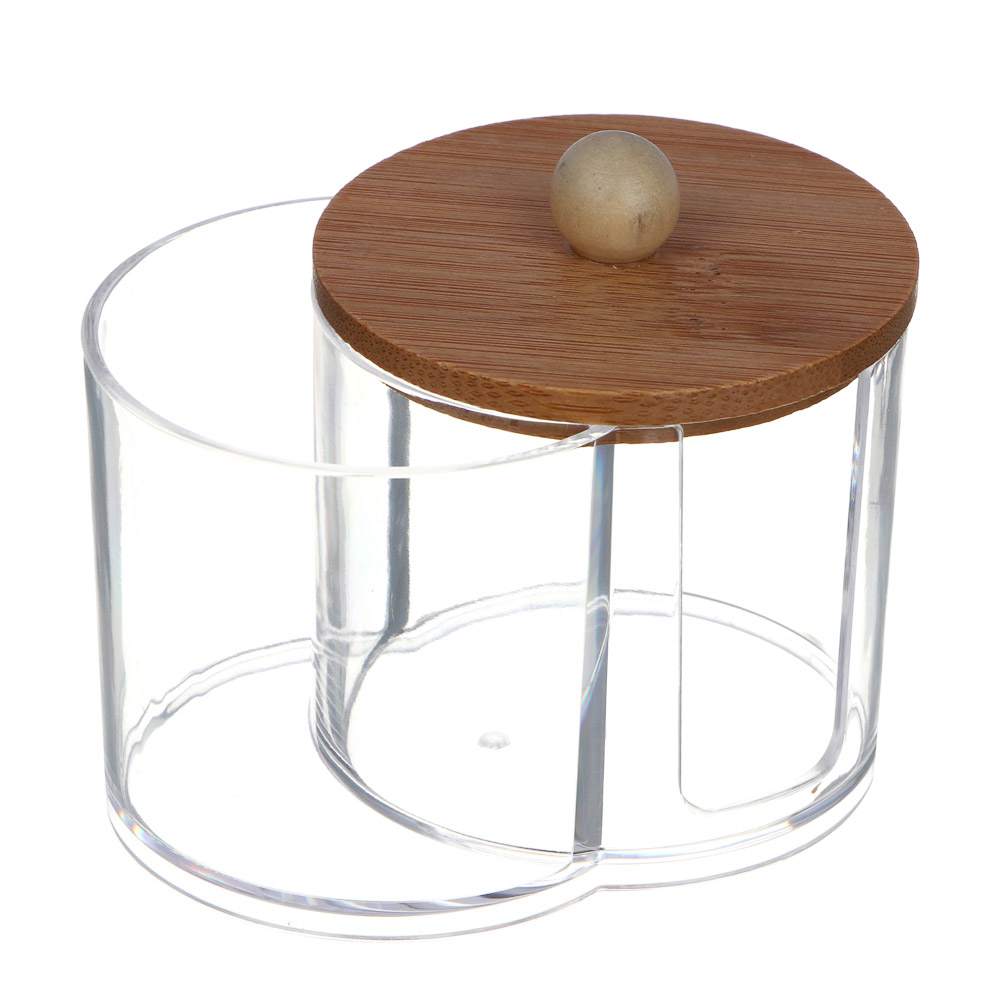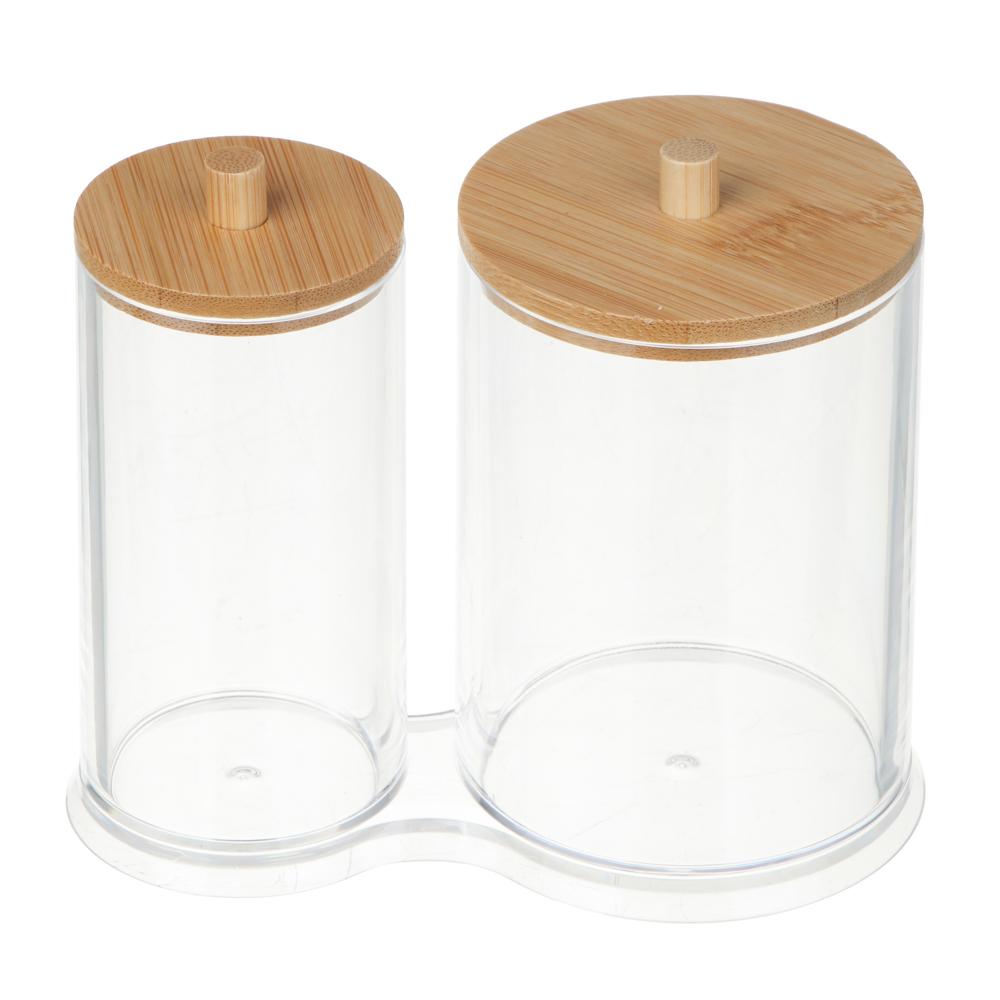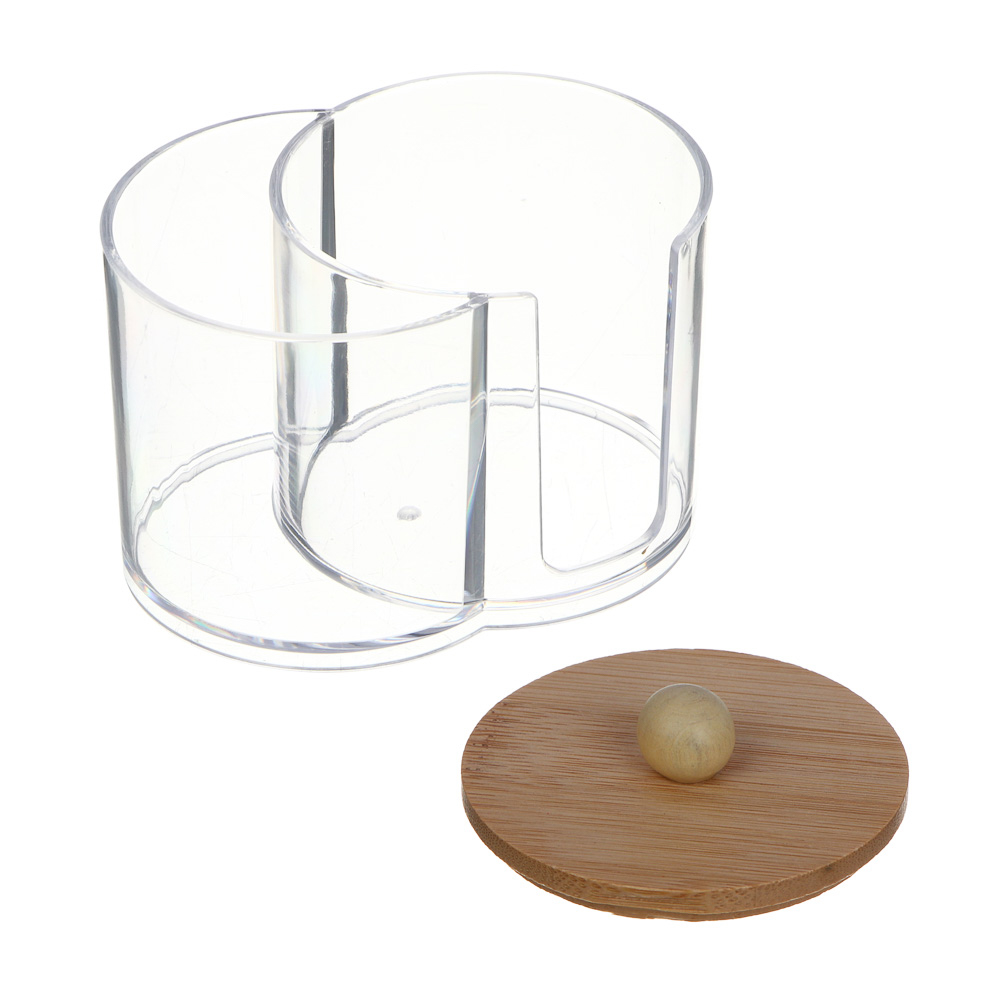 Функциональный двойной органайзер с прозрачным корпусом из полистирола предназначен для хранения различных косметических аксессуаров. Его два отдельных отсека, каждый с собственной крышкой из натурального бамбука, обеспечивают удобство и гигиеничность при использовании. Стильный и экологичный дизайн добавляет естественный акцент в ваш интерьер. Компактные размеры 13,5x7,6x10,2 см позволяют разместить органайзер на полке, в ванной или на туалетном столике, помогая поддерживать порядок и доступность косметики. Идеальный аксессуар для хранения ватных дисков, палочек и других мелочей!
