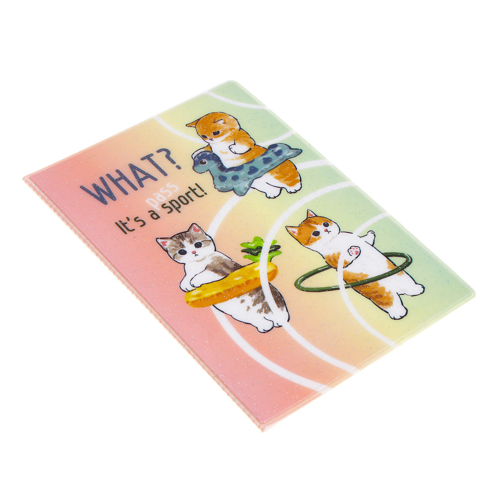 Обложка на паспорт с блестками, ПВХ, 13,6х9,5 см имеет забавный дизайн с котиками, поэтому особенно понравится подростку. Прекрасный выбор для первого паспорта. Обложка из ПВХ надежно защищает документ от повреждений и загрязнений. Не рвется, не деформируется, не выцветает и обладает отличной устойчивостью к истиранию. Плотно надевается на паспорт и не соскальзывает. 6 дизайнов в ассортименте.