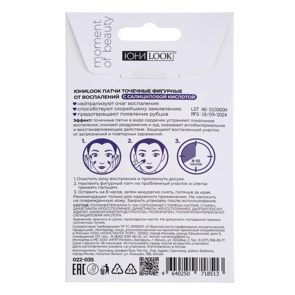 Патчи точечные фигурные от воспалений с салициловой кислотой ЮНИLOOK – это удобный формат средства для ухода за кожей лица. Точечное нанесение позволяет воздействовать только на проблемные зоны. Патчи эффективно нейтрализуют очаг воспаления, способствуют скорейшему заживлению и предотвращают появление рубцов. Специальные компоненты, входящие в состав средства, снимают раздражение и зуд, оказывают антибактериальное и восстанавливающее действие. 24 штуки в упаковке.