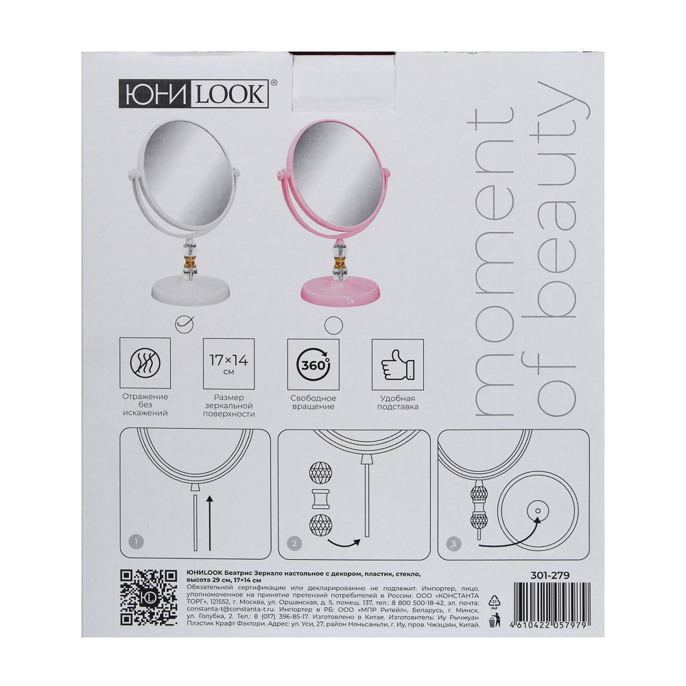 Настольное зеркало ЮНИLOOK Беатрис — элегантный аксессуар для дома и макияжа. Выполнено из качественного пластика и стекла, обеспечивающего четкое отражение без искажений. Зеркальная поверхность размером 17х14 см оптимальна для детализированного визуального контроля. Модель оснащена удобной подставкой и механизмом свободного вращения на 360°, позволяющим легко настроить нужный угол. Высота изделия — 29 см. Стильный декор делает его украшением туалетного столика. Практичное и функциональное решение для ежедневного использования.